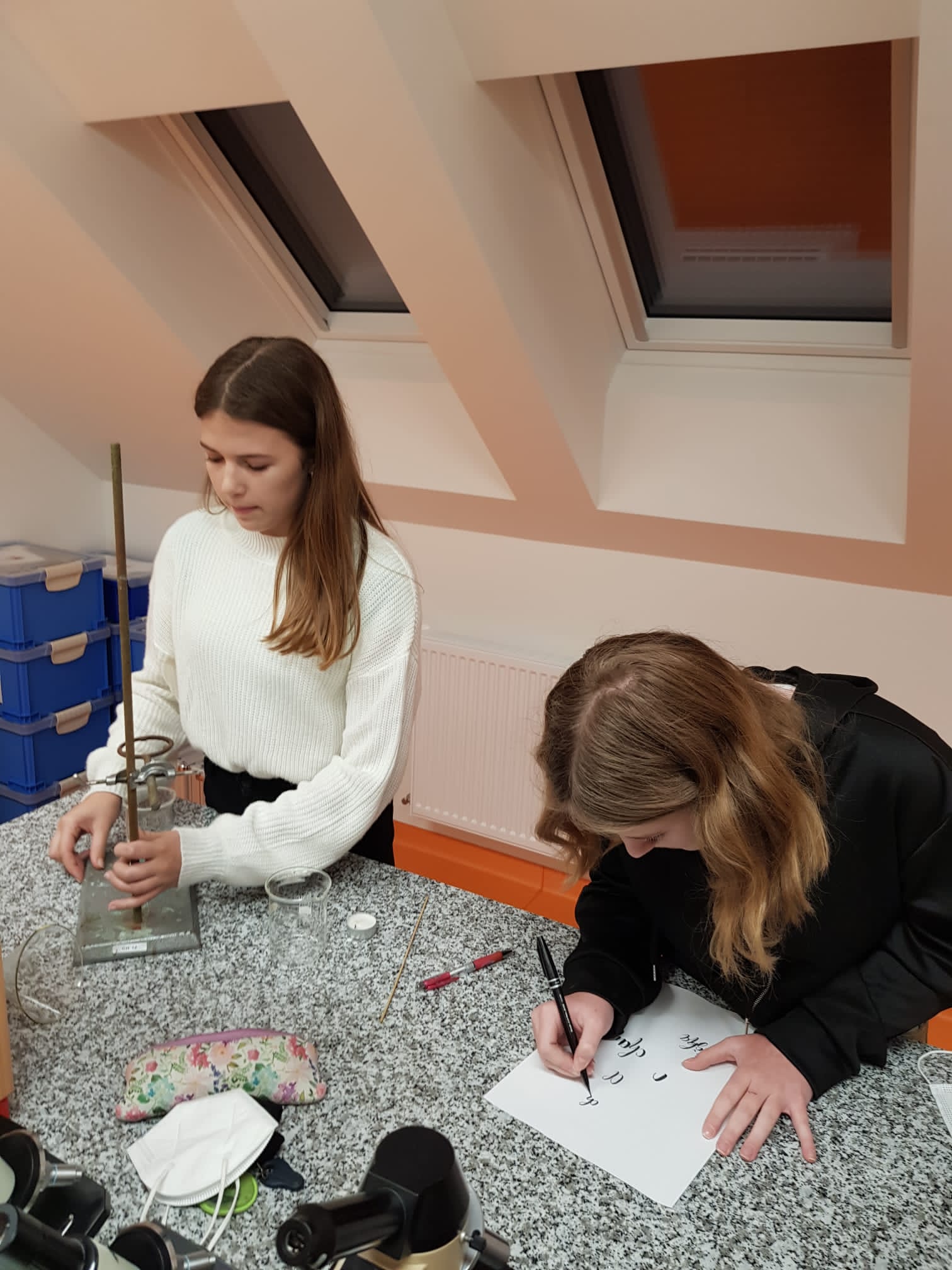 Konečně, po covidové pauze, můžeme zase s dětmi bádat a experimentovat. V rámci hodin chemie využíváme často právě učebny v půdní vestavbě. Skvělé je také to, že třídu můžeme rozdělit na 2 poloviny, kdy jedna část žáků pracuje přímo v laboratoři a druhá může vyhledávat informace v propojené učebně informatiky. To si vyzkoušeli také žáci 8. třídy při výuce o směsích. Je to jedno z témat, které žáky většinou hodně baví. Mohou si dle libosti vytvářet různě barevné koktejly, které jsou na pohled velmi atraktivní, ne však vhodné ke konzumaciJ. V dalších laboratorních pracích se pak učí oddělovat jednotlivé složky směsi pomocí různých metod – tentokrát pomocí filtrace a krystalizace…viz. foto