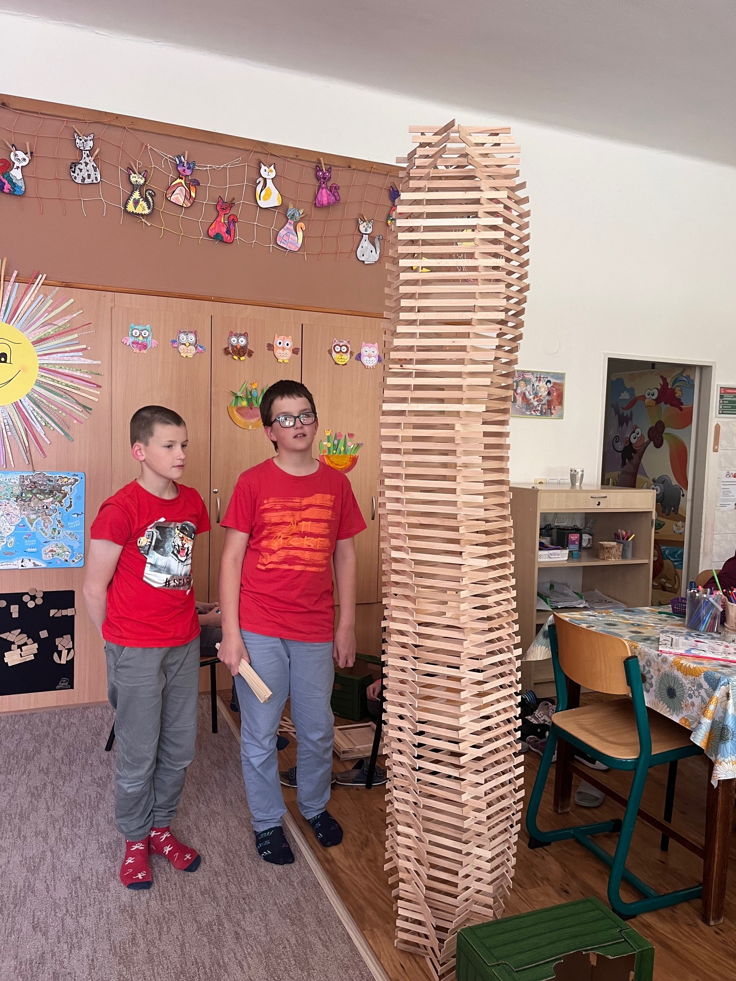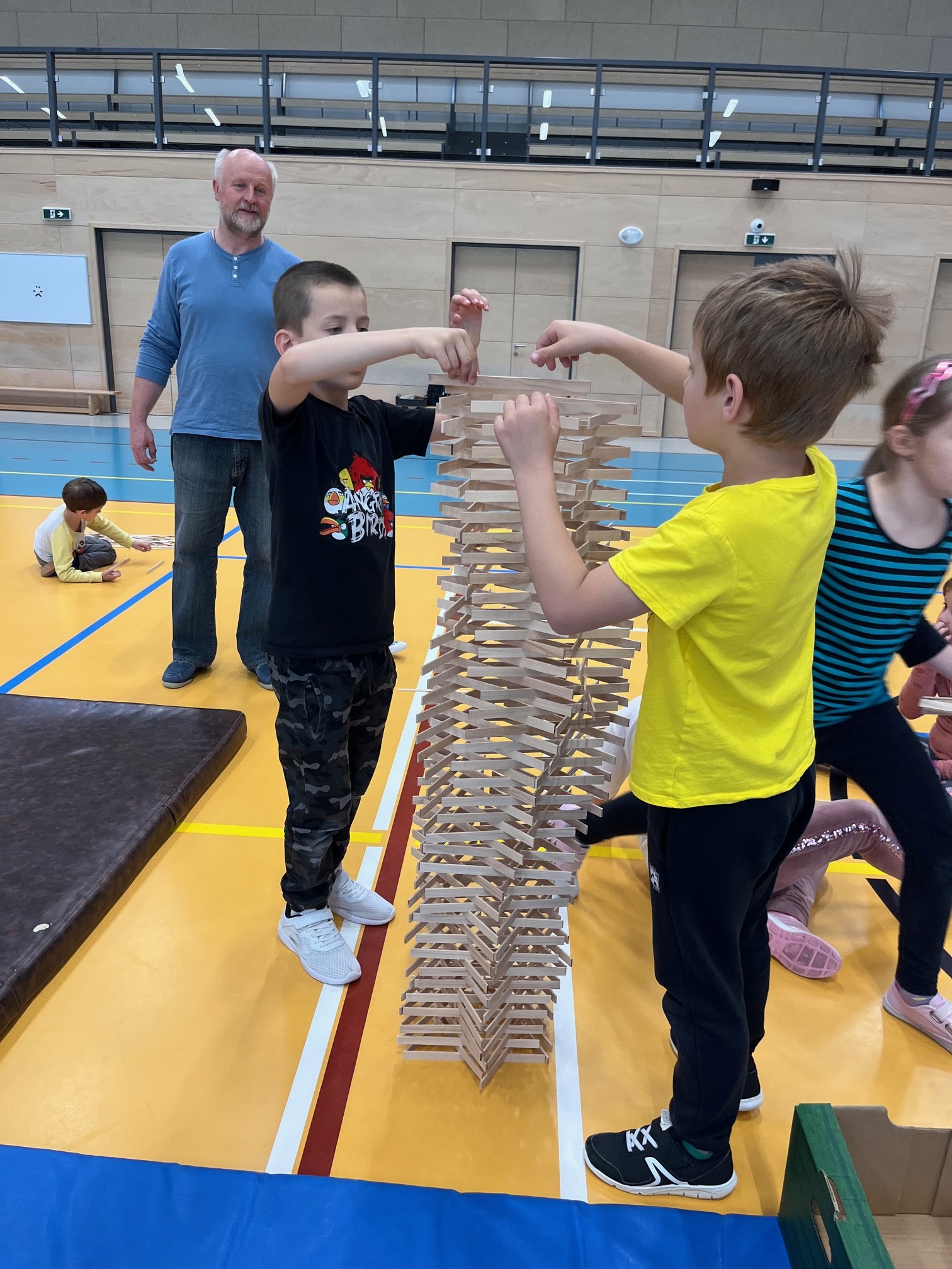 Ve školní družině Základní školy Hustopeče nad Bečvou proběhl netradiční projektový den, který spojil tvořivost, trpělivost a špetku fyziky. Děti se zapojily do originální aktivity: stavby věží z dřívek – jednoduchého, ale velmi efektního konstrukčního materiálu. Celý program pro nás připravil a vedl pan Samuel Fojtů, který dětem ukázal různé stavební techniky a vysvětlil, jak při stavění využívat rovnováhu a stabilitu. Děti tvořily jak ve skupinách, tak samostatně, a jejich úkolem bylo postavit co nejvyšší, nebo naopak co nejzajímavější věž. Všechny konstrukce vznikaly pouhým skládáním dřívek, bez použití lepidla či jiných spojovacích materiálů. To kladlo důraz na přesnost, trpělivost a cit pro rovnováhu. Soutěžní duch nechyběl, ale převládala spolupráce a společné hledání nejlepších konstrukčních řešení. Vrcholným momentem byla fáze, kdy děti mohly své věže „bourat“– ale ne jen tak obyčejně. Celý proces byl natáčen ve zpomaleném záběru, což přineslo dětem i pedagogům nečekaně poutavou podívanou. Díky moderní technice tak mohli všichni sledovat, jak se jejich stavby postupně bortí a analyzovat, co způsobilo pád, nebo které části konstrukce byly nejodolnější. Děti se bavily, učily se základním principům stavitelství, týmové práci i fyzikálním zákonům. Zpomalené záběry byly třešničkou na dortu – děti mohly vidět věci, které by okem v reálném čase nezaznamenaly.