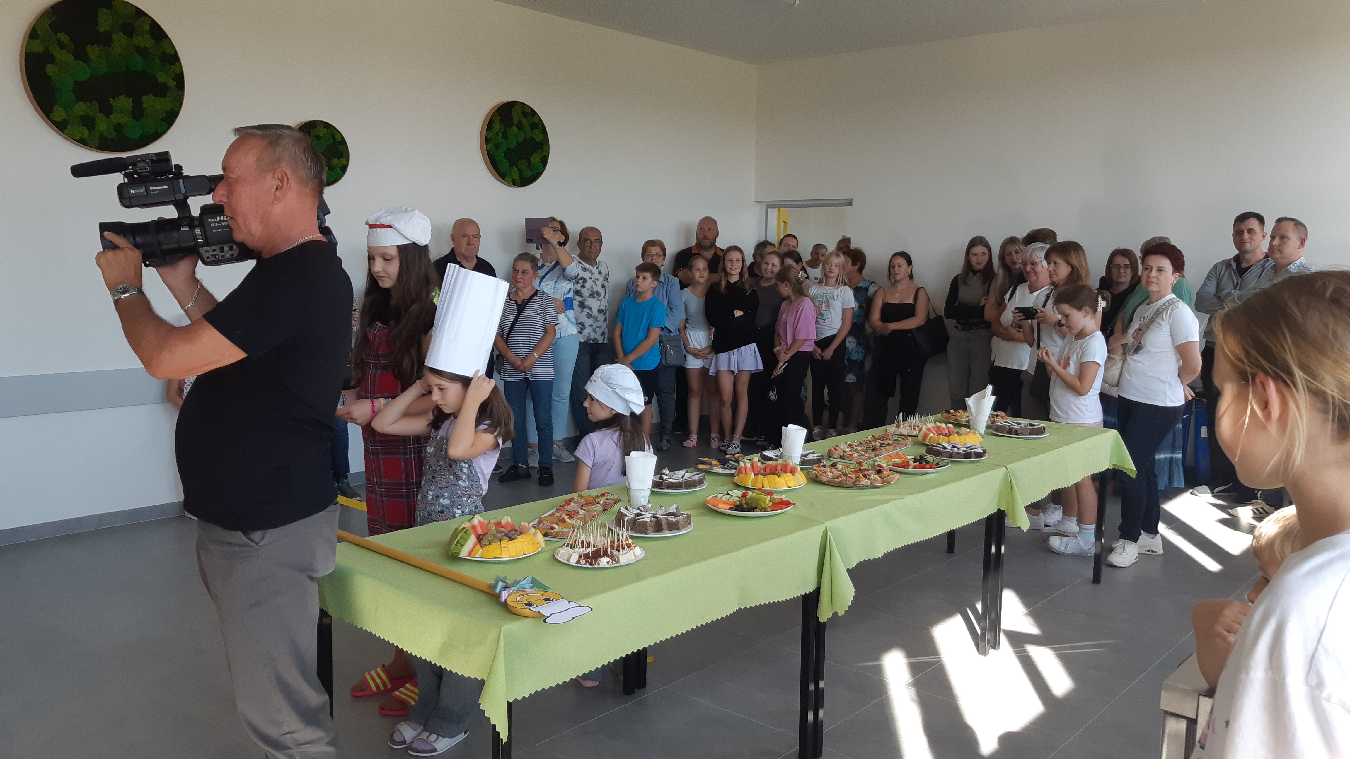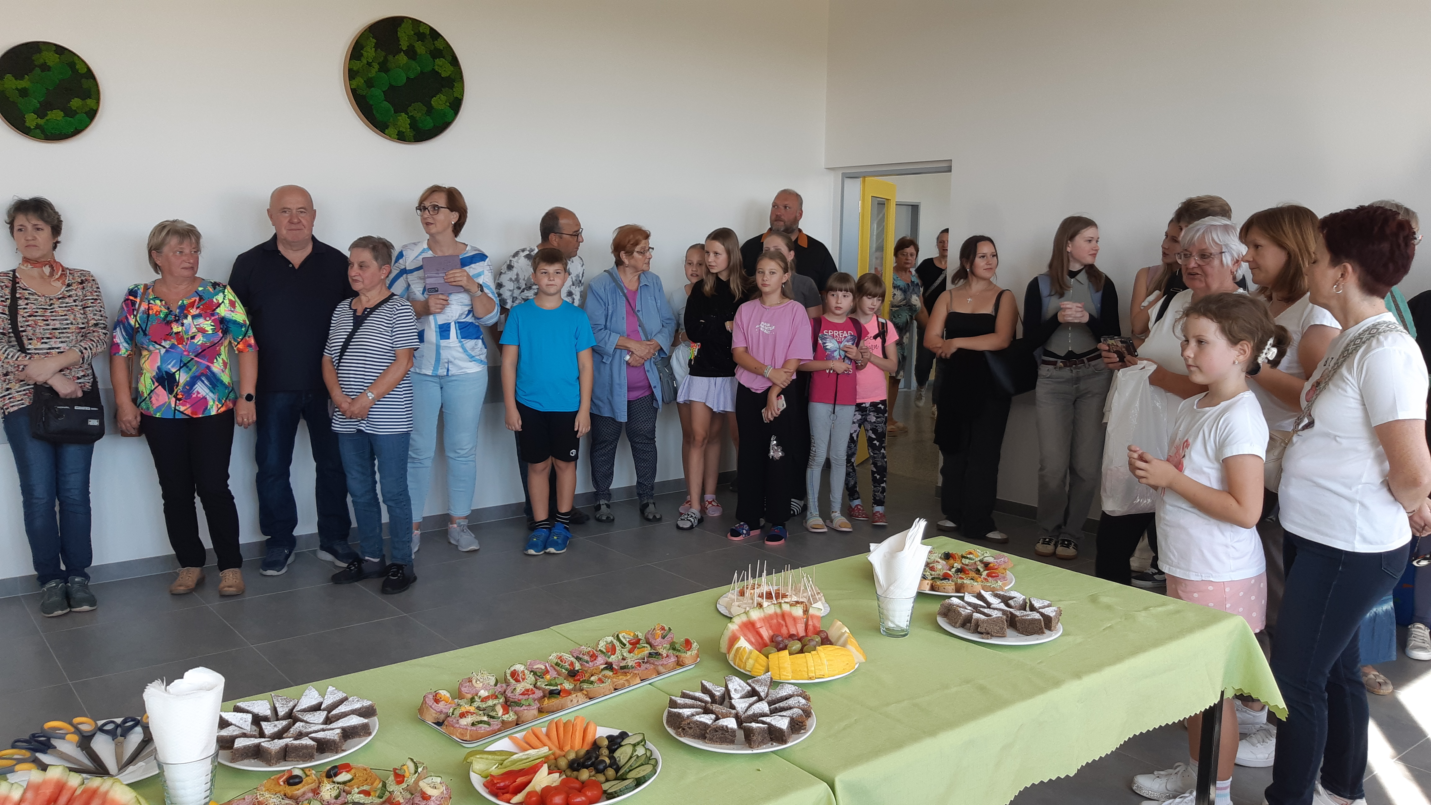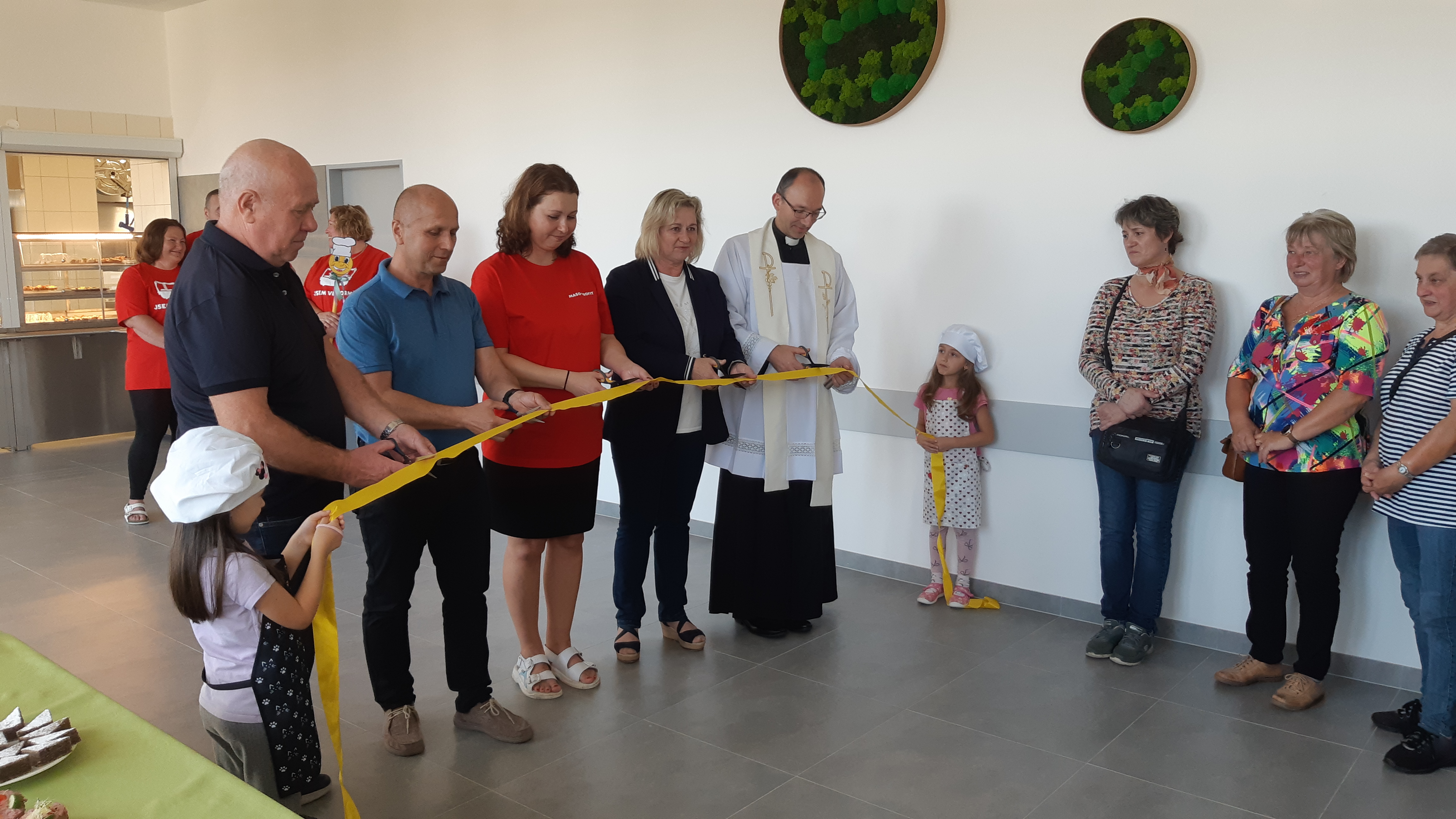 Program obohatily i žákyně naší školy. Dívky ze 4. a 6. třídy popřály panu kuchaři a paním kuchařkám spoustu chutných a zdravých jídel, zatímco žákyně 9. ročníku připravily pro hosty drobné občerstvení. Následně se mohli hosté zúčastnit prohlídky zázemí nové jídelny a popovídat si se zaměstnanci o jejím fungování.