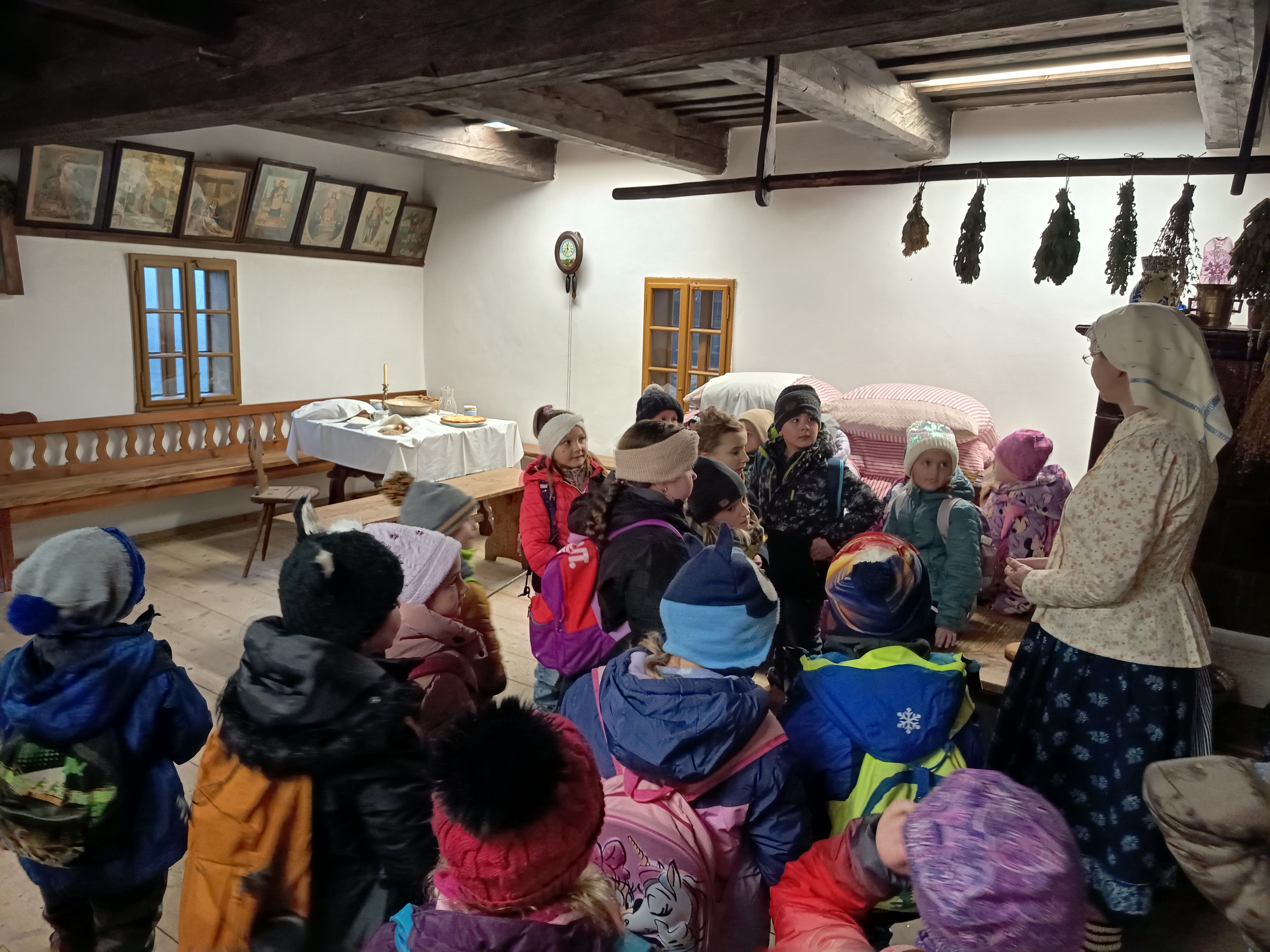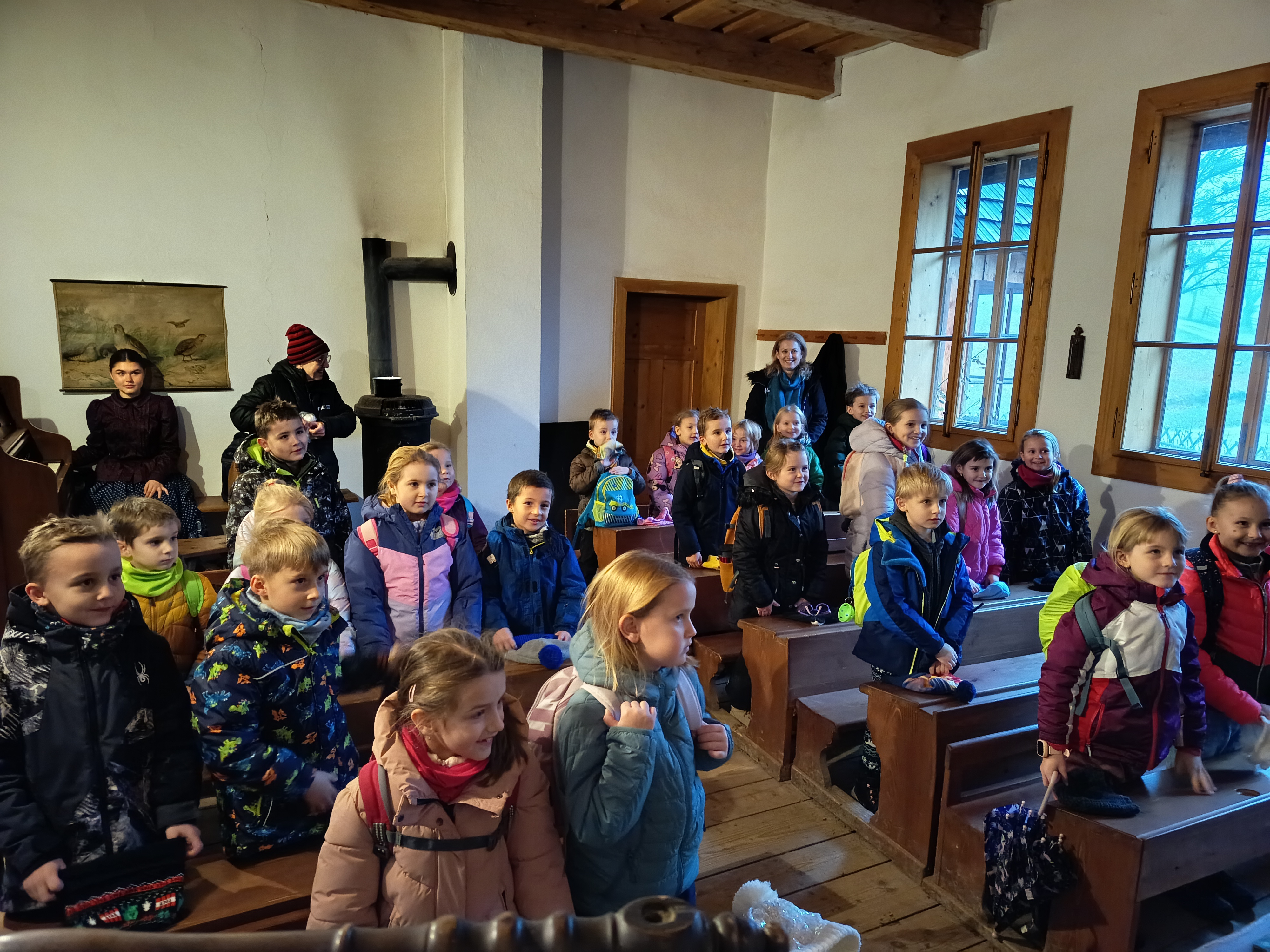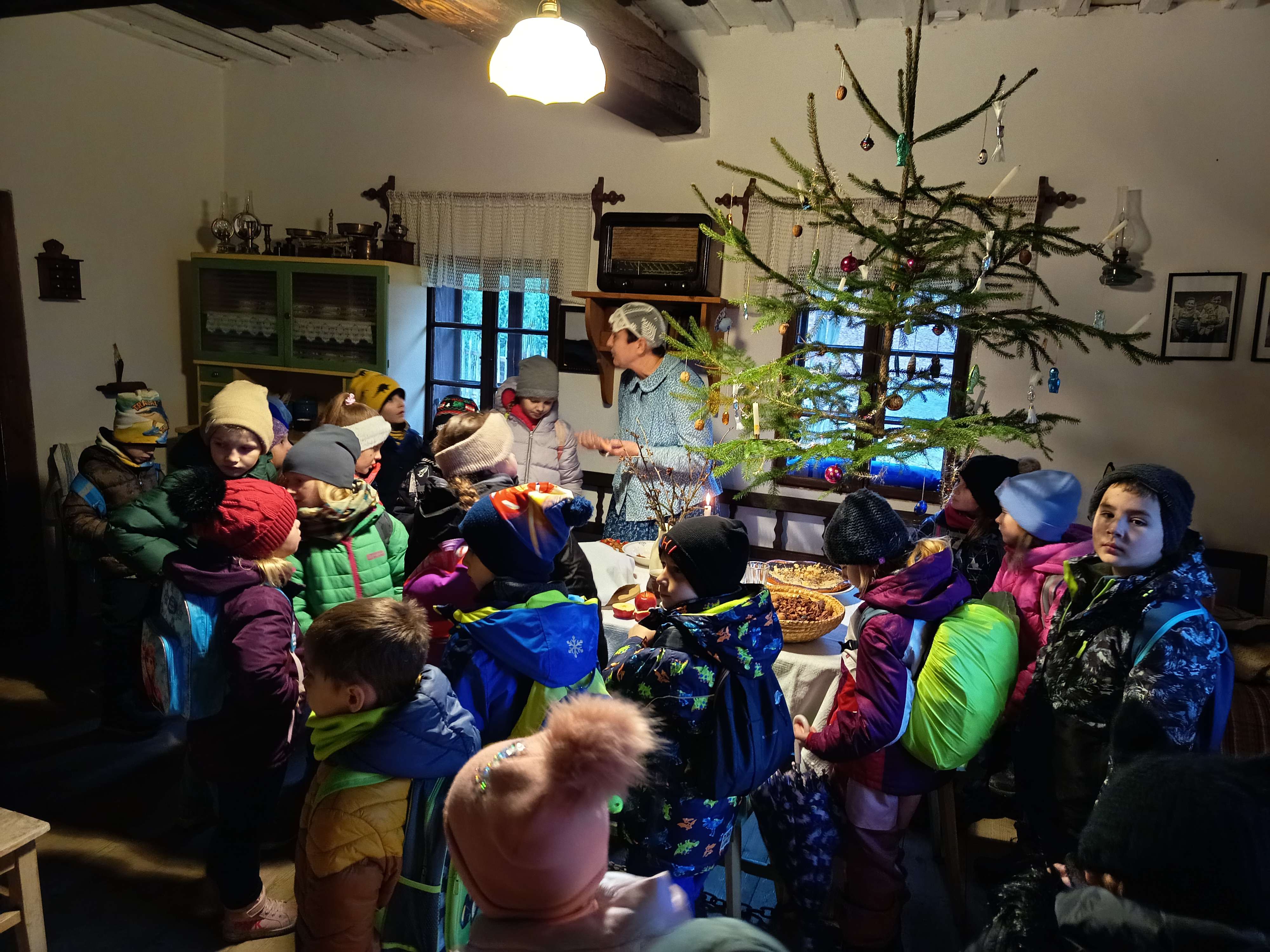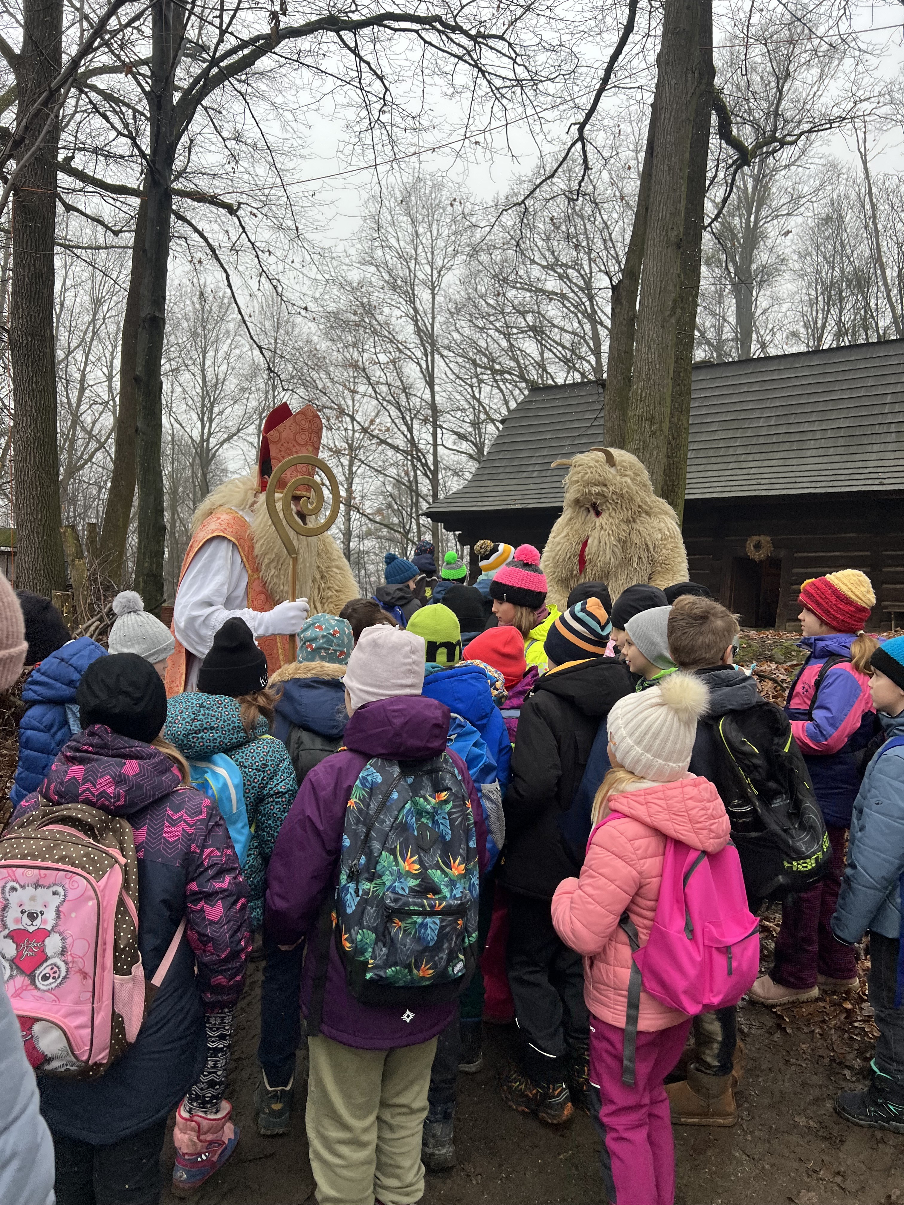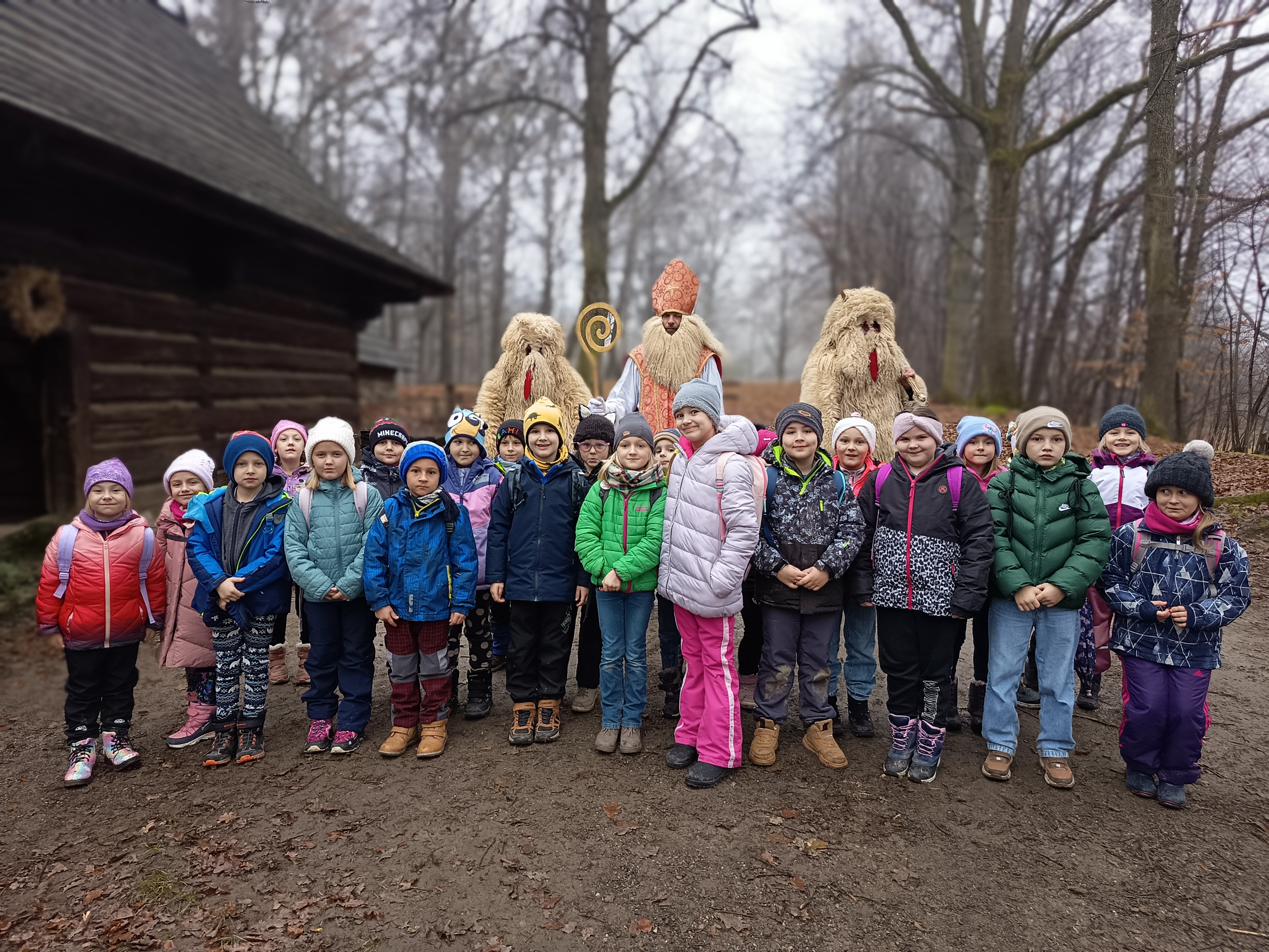 Ve čtvrtek 11. prosince se žáci 1. – 4. třídy zúčastnili programu Vánoce na dědině ve Valašském muzeu v přírodě v Rožnově pod Radhoštěm. Program nám přiblížil, jak probíhaly vánoční svátky na valašské vesnici v minulosti. Měli jsme možnost nahlédnout do slavnostně vyzdobených chalup, seznámit se s tradičními zvyky a obyčeji adventního i vánočního období a vyslechnout si výklad o tehdejším způsobu života. Součástí návštěvy byly také ukázky lidových řemesel, zpěv koled, setkáni se sv. Lucií, čerty a Mikulášem, který v košíku našel dobrotu v podobě sušených jablíček. Celkově se program ukázal jako skvělý způsob, jak přiblížit žákům vánoční zvyky a tradice, které dnes již nejsou tak běžné a byl také i kulturním zážitkem, který výrazně přispěl k obohacení vánoční atmosféry.